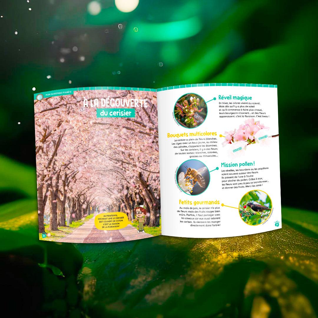 • Explore ton magazine : Rencontre un bébé léopard, observe un cerisier en fleurs et explore la mare et ses habitants.