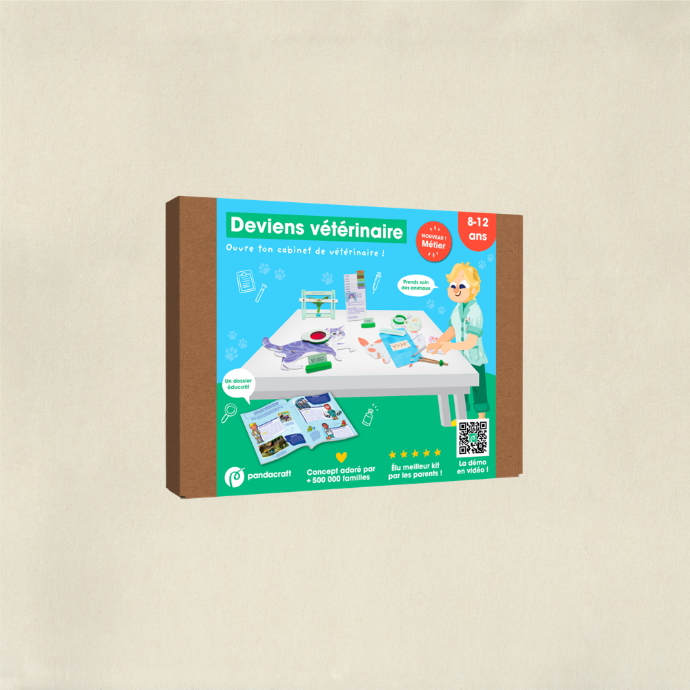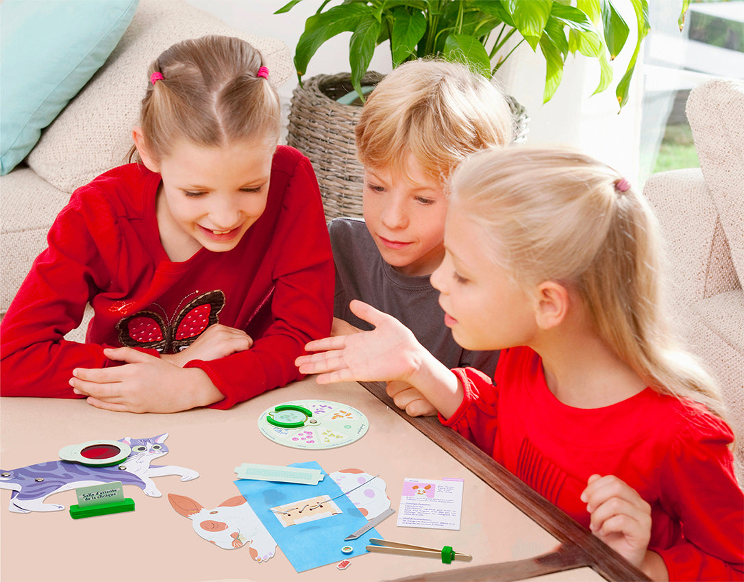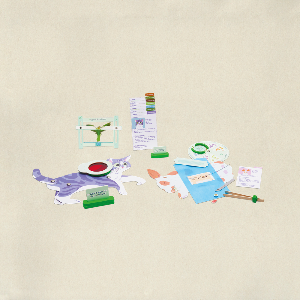 Très bonne idée pour offrir : ce kit est vendu dans une belle boite pour être plus facilement offert en cadeau ! Te voici vétérinaire ! Créé ton cabinet et accueille différents animaux pour les soigner.
