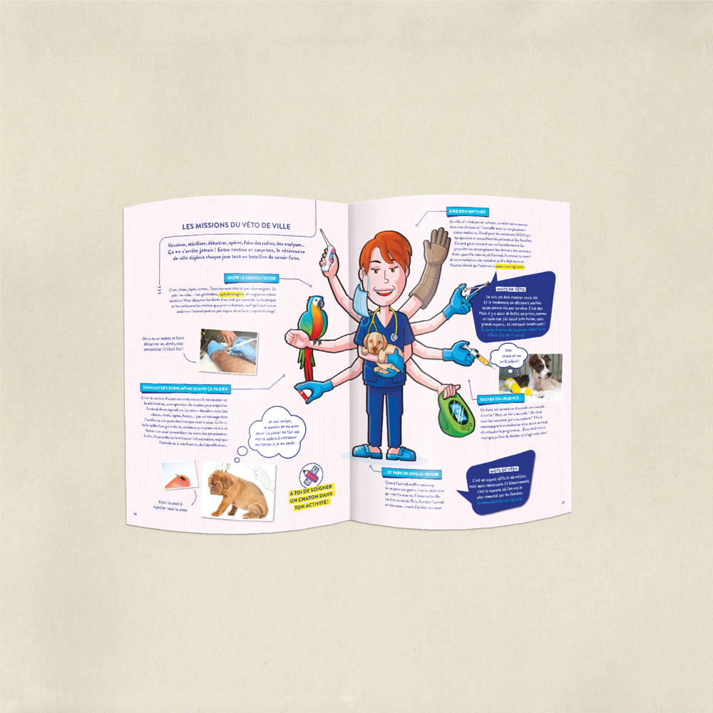 - 1 livre documentaire avec un dossier éducatif pour découvrir le métier de vétérinaire : en ville, à la campagne, pour les animaux sauvages…